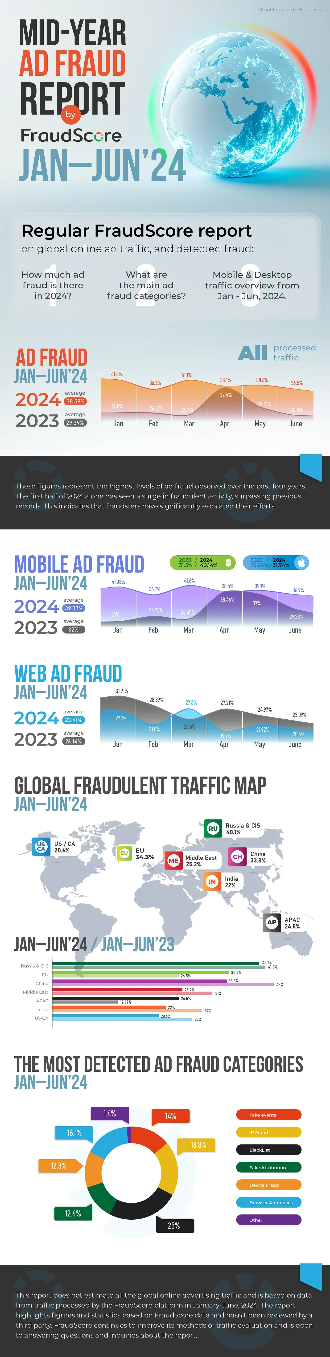 To get a more detailed understanding of the current state of ad fraud, consider reviewing the mid-year ad fraud report by FraudScore. This comprehensive report provides insights into global online advertising traffic and the specific types of fraud detected: