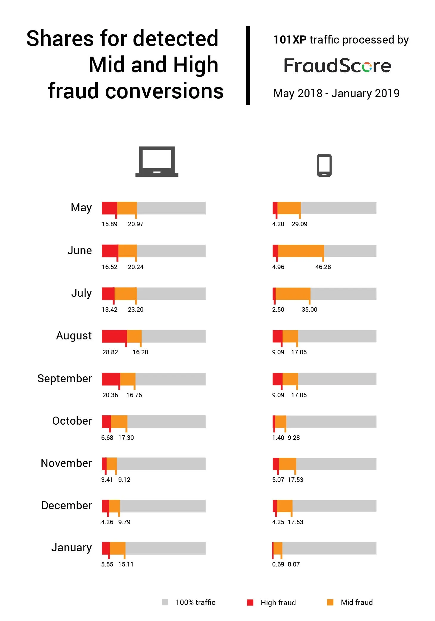 Together with FraudScore data scientists and managers, we’ve conducted research — we’ve made specific reports for traffic quality analysis and compared it with our budgets spent from May 2018 to the end of January 2019.