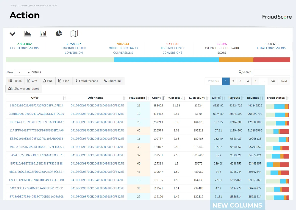 Our recent update widens the range of data that FraudScore’s report gives to traffic managers. From now on — FraudScore demonstrates CR, Revenues and Payouts for each source (campaign), and saves time and efforts of the users: