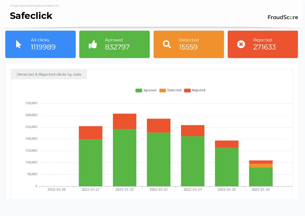 SafeClick is FraudScore’s solution to fight click fraud in real time. SafeClick checks if the click is fraudulent or genuine, and based on the click quality — sends it either to the target URL or redirects it to the fallback URL.