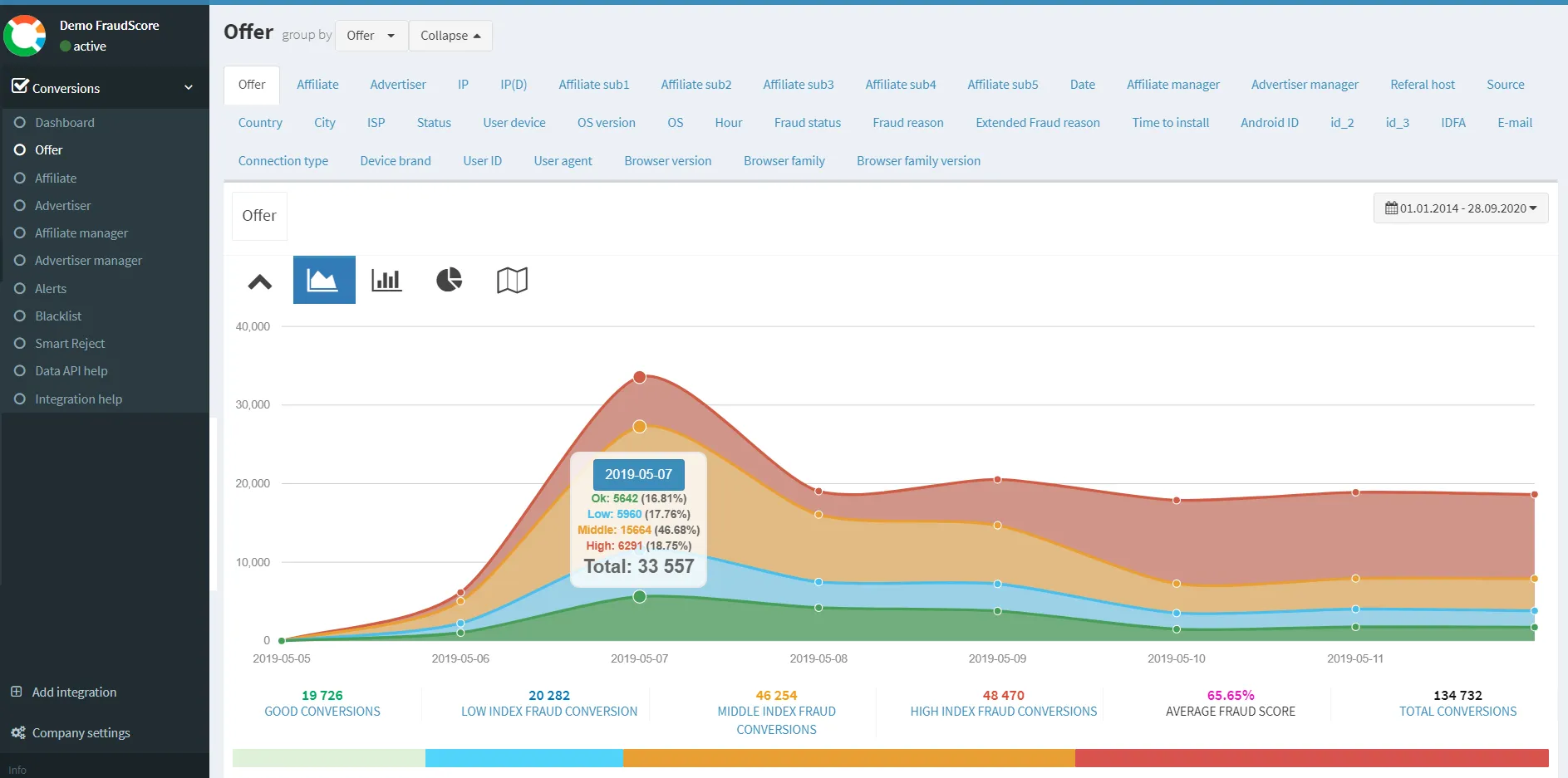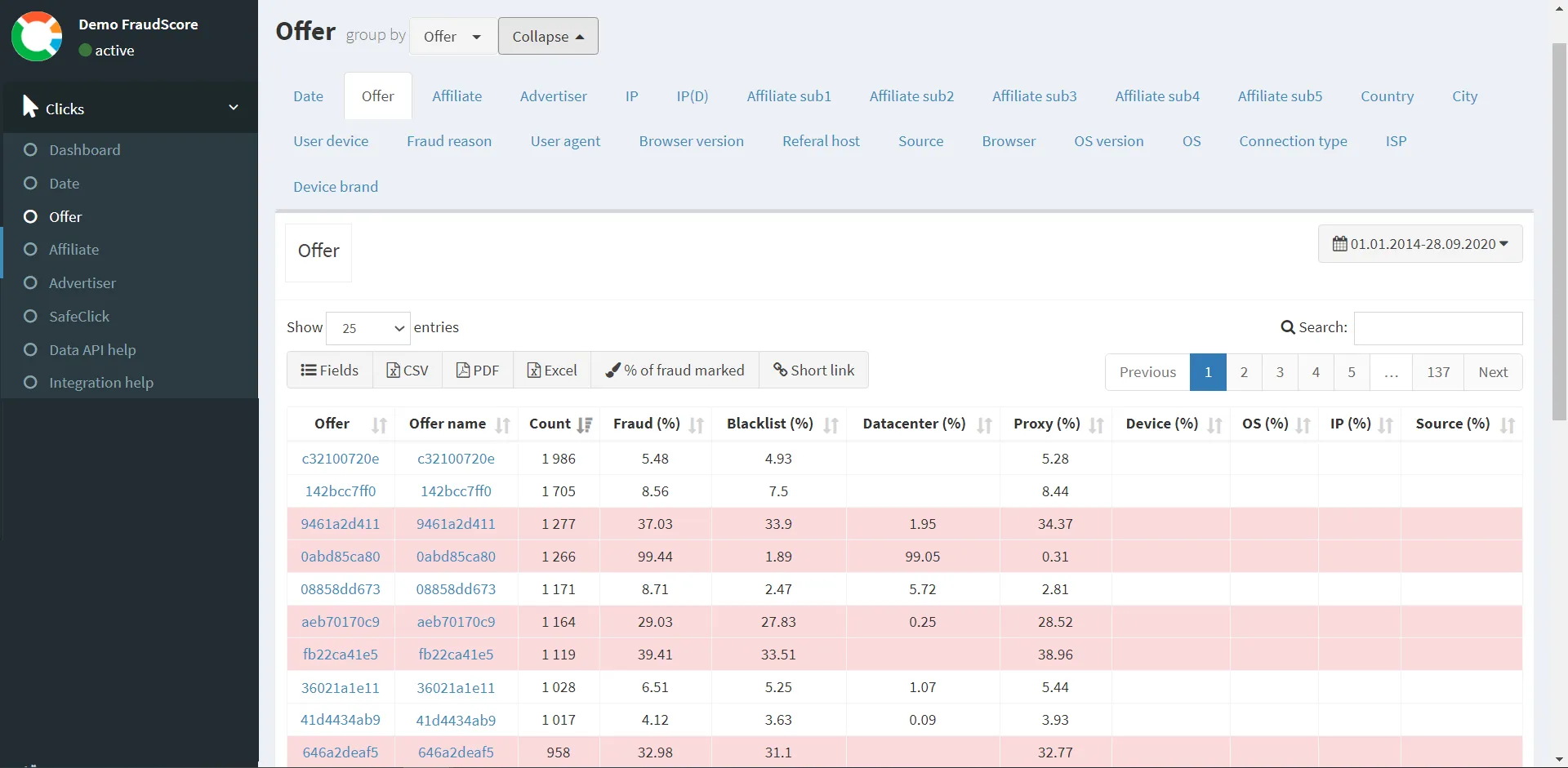 The FraudScore team has managed to develop ad fraud reports that are recognized by marketers as one of the easiest to use. FraudScore managers have experience in online advertising and they have used their knowledge to design reports that can be understood and analysed by marketers that don’t specialize in fraud. There are options to drill down the fraud reports from various slices: from affiliates, offers and advertisers to all sub-affiliates, IPs, or different GEOs, detected fraud types or sources and many more. Moreover, all reports can be shared with partners via Excel, a short link or a PDF file, or you can even set up accounts for your traffic partners.