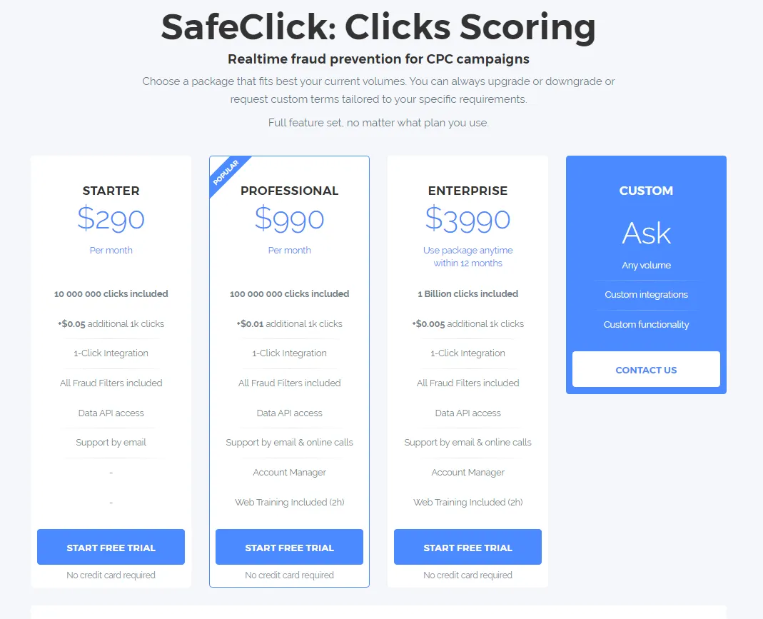 Clicks pricing starts from $290 per month. There is also a custom plan available. Detailed pricing below: