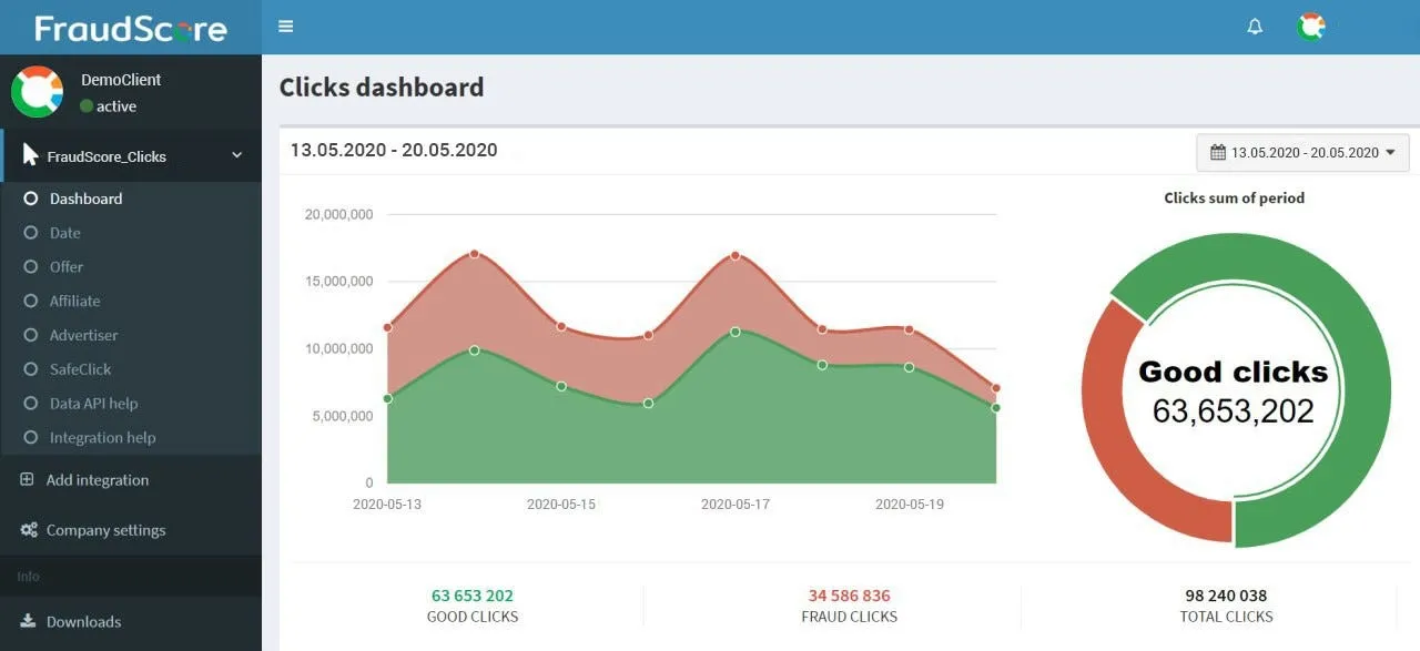 - FraudScore.RT — This is a product specifically developed for CPC/CPM campaigns. Key customers are DSPs, SSPs and ad networks. It’s a real-time fraud detection platform that filters fraudulent clicks and impressions almost instantly and prevents fraudulent clicks from turning into conversions. Each click is marked with the detected ad fraud type and can be further investigated to build a fraud case.