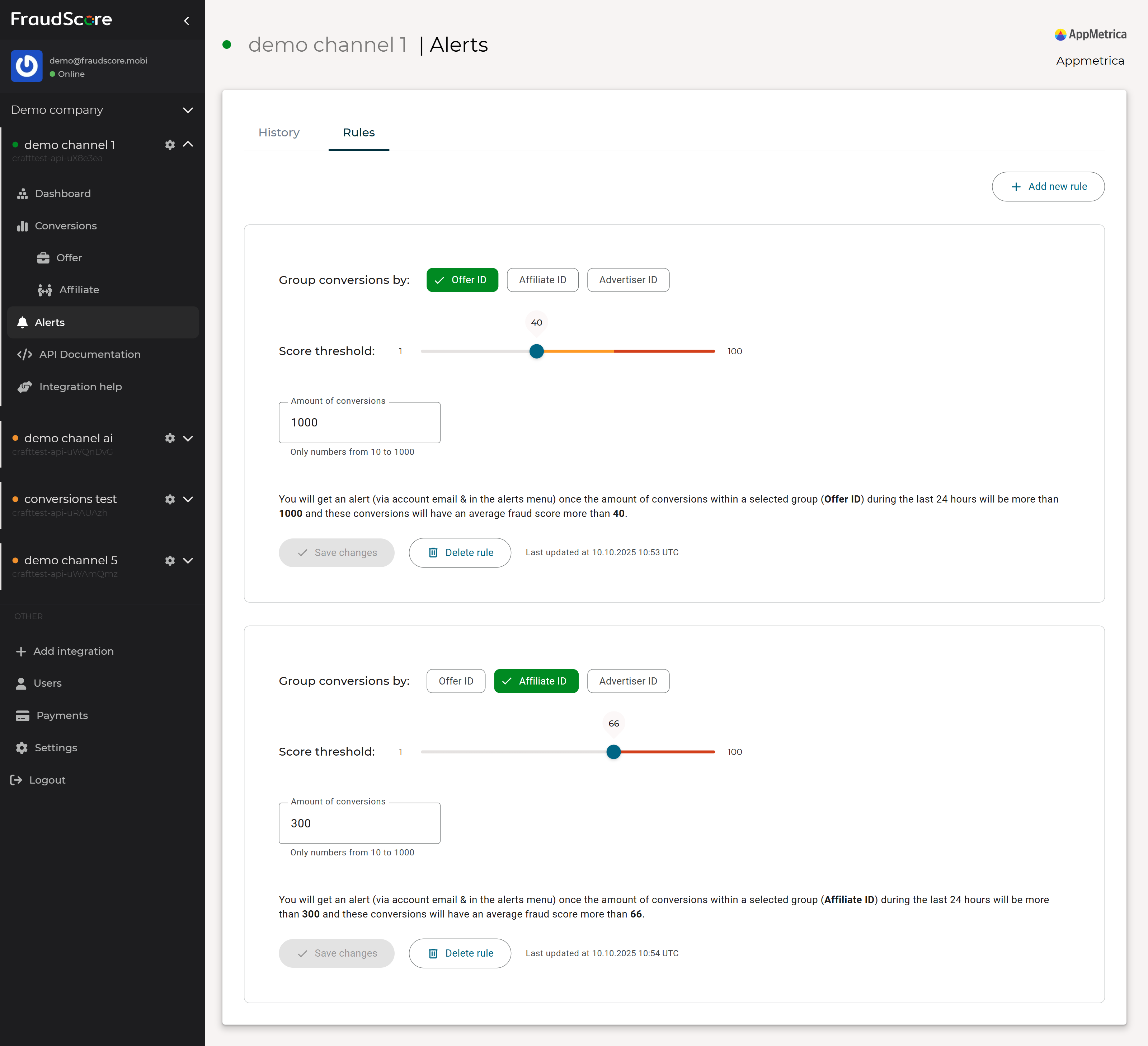 Alerts allows you to receive notifications when the FraudScore in a selected data segment (such as by source or campaign) exceeds a set threshold. This eliminates the need to manually monitor changes.